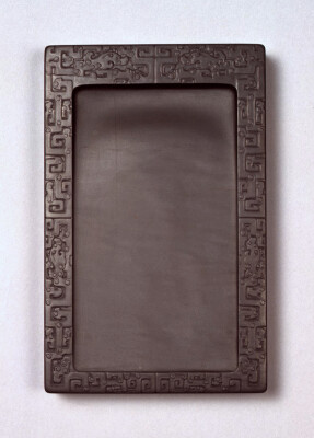 硯 秦時代初期(紀元前3世紀頃)の墓から、石製で板状の「研(硯)」が出土しており、主に丸い形をしていました。後漢時代までは、墨を磨りつぶすための研石がセットになっていましたが、しだいに手で墨を持って磨る「硯」へと変化し、素材も石製から陶磁製へ移りました。形は円形が主流でしたが、唐時代に箕形(きけい、農具の箕に似た形)の硯が生まれ、それが長方硯へと推移しました。安徽省の歙州硯(きゅうじゅうけん)や広東省の端渓硯(たんけいけん)など、漢時代とは異なる良質な硯材の開発もあり、宋時代から素材は石製が主流となっていきました。石質、石紋、発墨(はつぼく、硯で磨った墨の濃淡や光沢)などが賞玩されます。