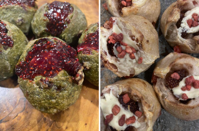抹茶と薔薇のアロマを練り込んだ生地にクランベリーを合わせ、サワークリームを包み焼き上げた後、上に自家製フランボワーズジャムをのせました。