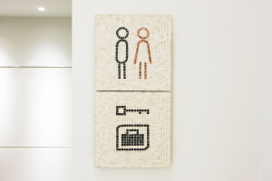 モザイクタイルでできた館内の案内サインは、ワークショップに参加した親子など約80人の手によるものです。市民に開かれ、末永く愛される美術館となるようにとの願いが込められています